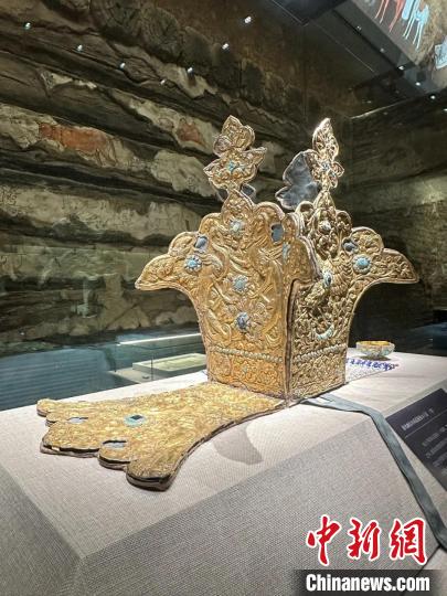 2019年,考古人員在發(fā)掘過程中,意外發(fā)現(xiàn)了一個隱藏在墓室外壁的暗格。暗格內(nèi)放置著一件珍珠冕旒龍鳳獅紋銀飾金王冠和一件鑲嵌綠松石四曲鋬指金杯。兩件文物制作精美、工藝精湛,對研究青海地區(qū)多民族多元文化交往交流交融具有重大意義。