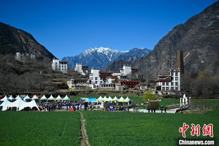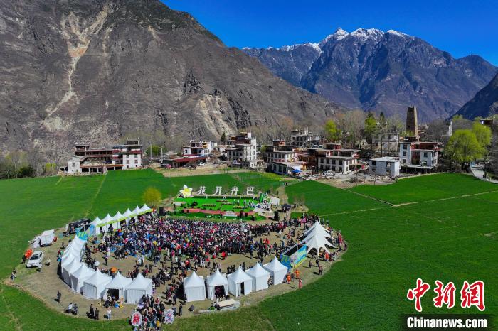 3月25日,四川丹巴,中路藏寨海子坪田野上的音樂會吸引了不少村民或游客。(無人機照片)中新社記者 劉忠俊 攝