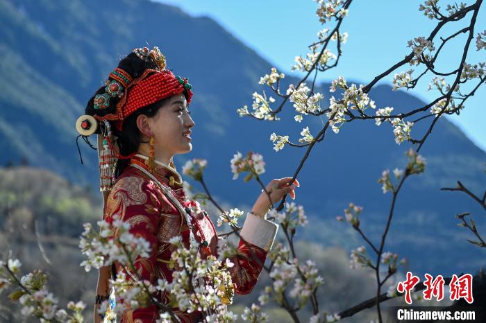 3月25日,四川丹巴,暖陽下賞梨花的丹巴女孩。中新社記者 劉忠俊 攝