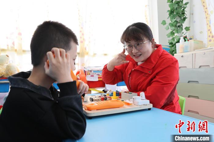 3月31日,青海西寧,特教老師黨萬紅幫助孤獨(dú)癥兒童練習(xí)日常動作。青海省西寧市星光特殊兒童服務(wù)中心現(xiàn)有四十多名特教老師,他們用愛點(diǎn)亮“星星的孩子”內(nèi)心世界,幫助這些孩子更好地融入學(xué)校生活、走向社會。張忠蘋 攝