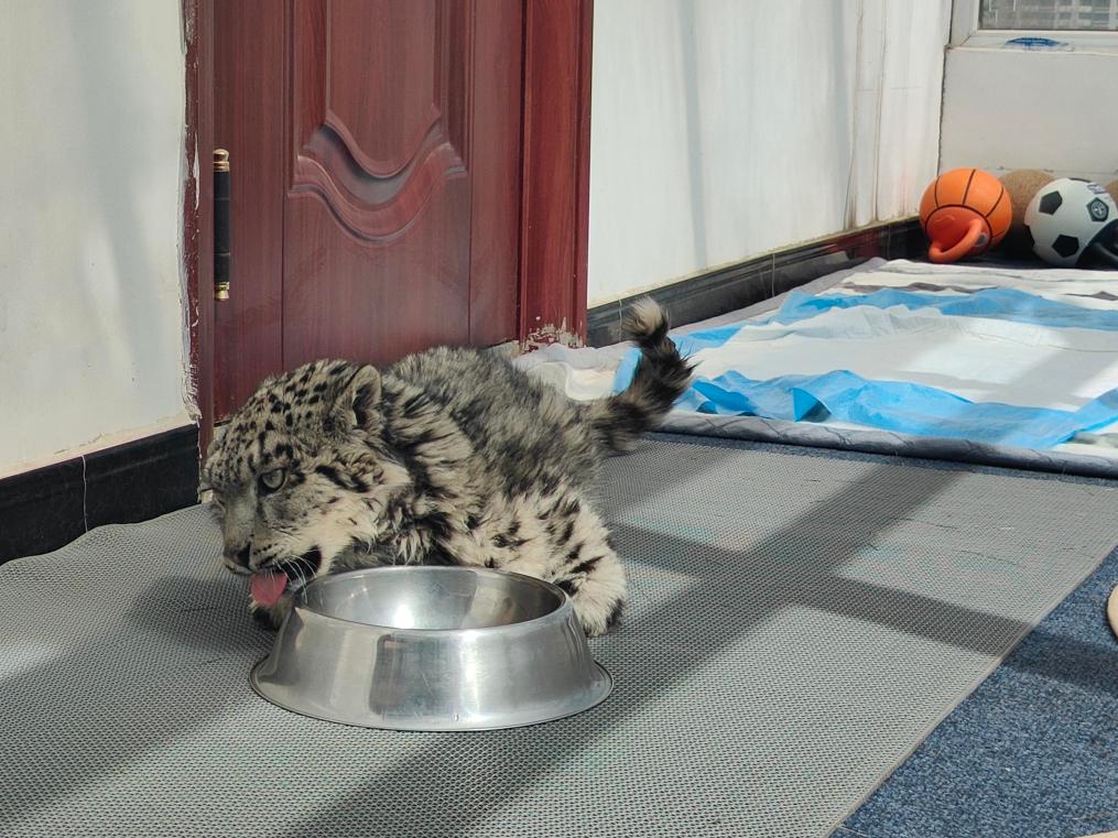4月4日,“凌小蟄”在吃飽后舔舐飯盆。青海野生動(dòng)物救護(hù)繁育中心供圖