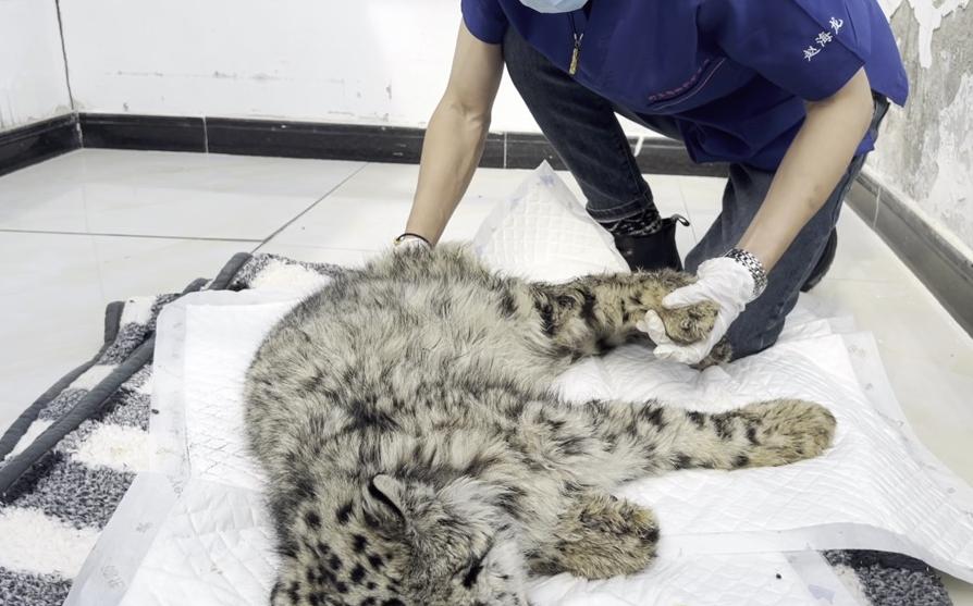 “剛送來(lái)時(shí),小雪豹身型干枯、四肢伸得直直的、頭部向后仰著,”救護(hù)中心副主任齊新章回憶,“小小的一坨,瘦弱得讓人心疼”。