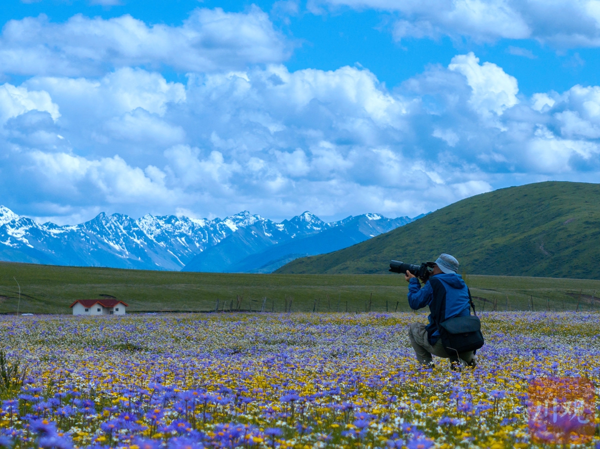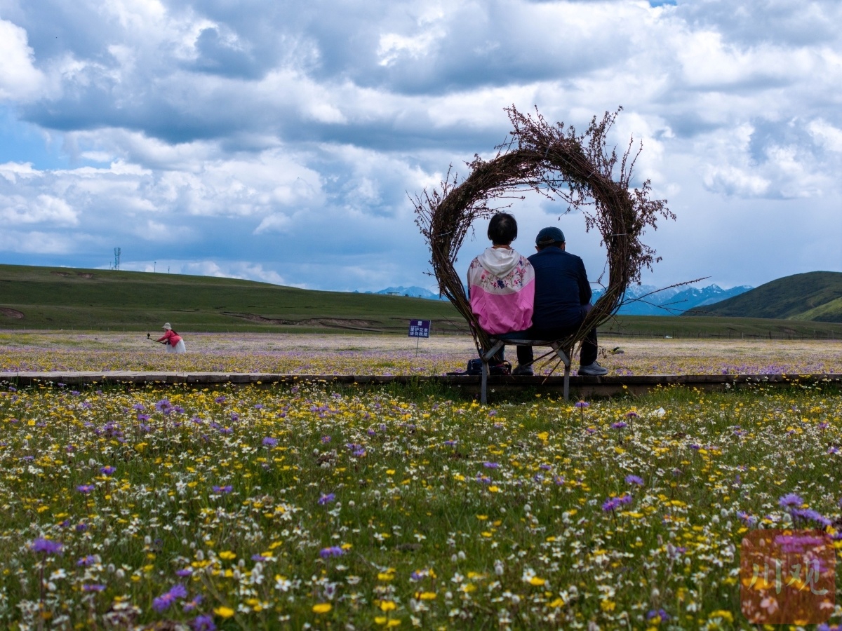 6月25日,游人在花海間遠(yuǎn)眺草原、雪山美景。陳先林 攝
