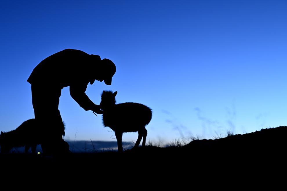 可可西里管理處索南達杰保護站,巡山隊員與被救助的藏羚羊幼仔在一起。新華社記者 張宏祥 攝