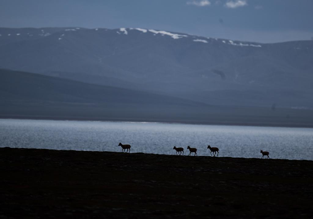 在可可西里卓乃湖區(qū)域,幾只藏羚羊在活動(dòng)。 新華社記者 張龍 攝