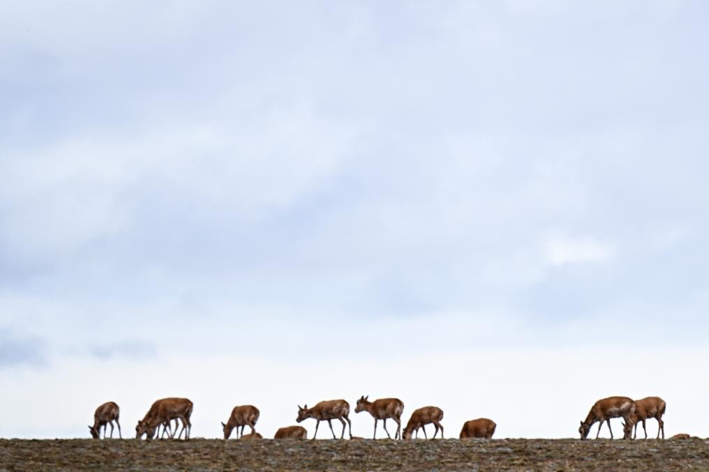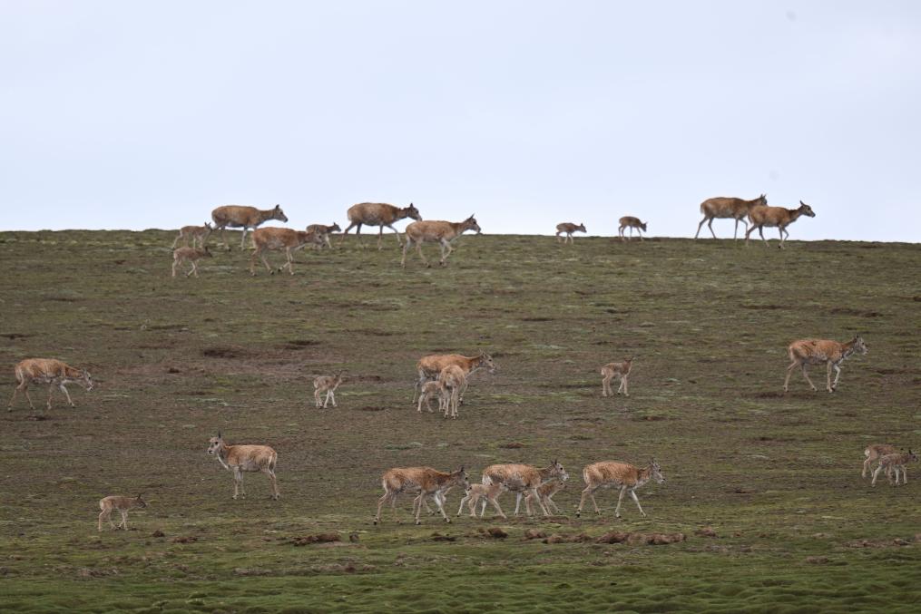 在可可西里卓乃湖區(qū)域,一群藏羚羊在活動(dòng)。新華社記者 張龍 攝