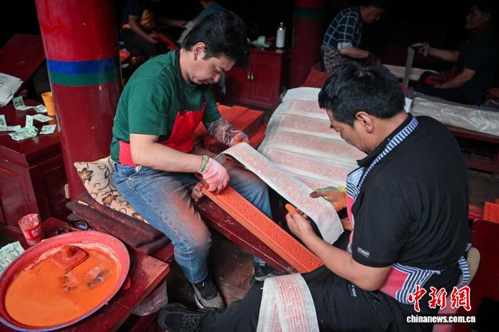 在藏版庫旁的印刷工坊里,10多名工匠正在忙碌。部分工匠手持墨刷,在《丹珠爾》印版上均勻涂墨,另一部分工匠不停翻轉(zhuǎn)印刷紙張或換新紙?!案瞎そ硞儗W(xué)了幾十年,從選料到印刷,每一步都不能急?!?2歲的西繞彭錯(cuò)已在印經(jīng)院工作41年,他指著桌上用瑞香狼毒草根皮制成的印紙介紹,這種紙要經(jīng)過泡、煮、捶打等11道工序,“紙的韌性好,放幾十年都不會(huì)壞,蟲不蛀、鼠不咬,老祖宗傳下來的法子,錯(cuò)不了?!闭f話間,西繞彭錯(cuò)已將印紙平整鋪在版上,用特制印版輕壓,片刻后揭下,一行行雋秀的藏文便清晰呈現(xiàn)。正是這群工匠對(duì)傳統(tǒng)技藝的堅(jiān)守,讓雕版技藝成為活態(tài)的文化遺產(chǎn)。