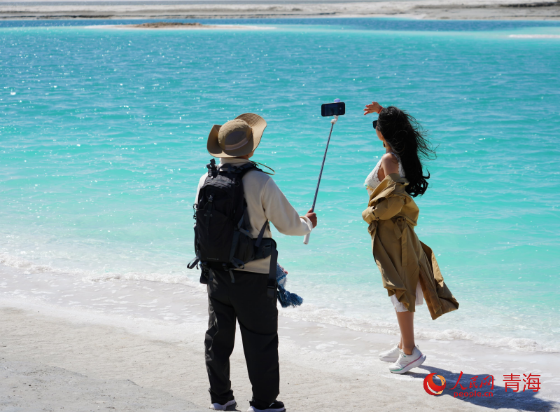 游客在大柴旦翡翠湖拍照。人民網(wǎng)記者 況玉 攝