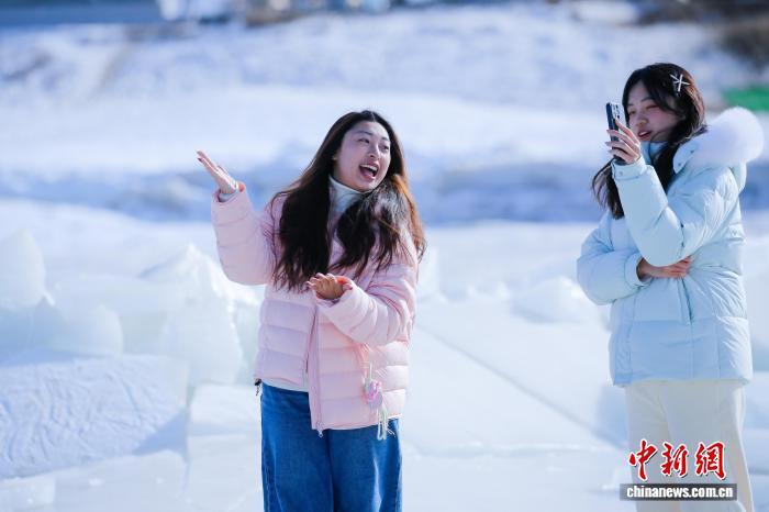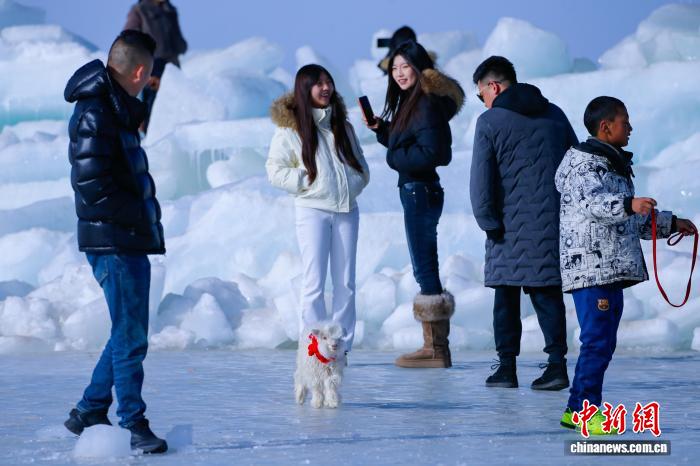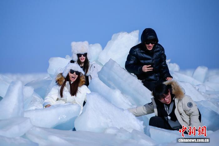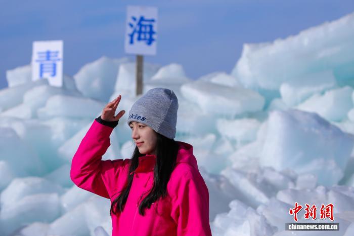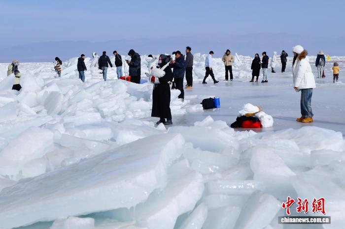 1月28日,青海共和,游客在青海湖二郎劍景區(qū)藍(lán)冰景觀前拍照打卡。受湖水流動、風(fēng)力等因素影響,青海湖面結(jié)冰過程中會推動冰層碰撞堆疊,形成天然冰堆群,在陽光照射下呈淡藍(lán)色。中新社記者 馬銘言 攝