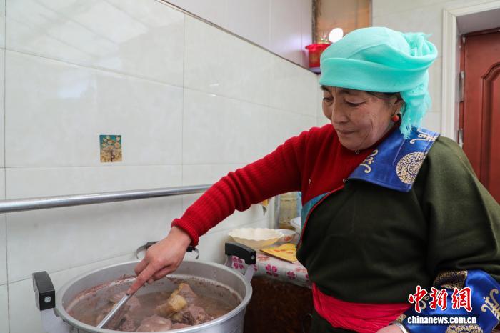 2月16日,中國農(nóng)歷除夕,卓瑪措煮牦牛肉準(zhǔn)備新年餐食。中新社記者 馬銘言 攝