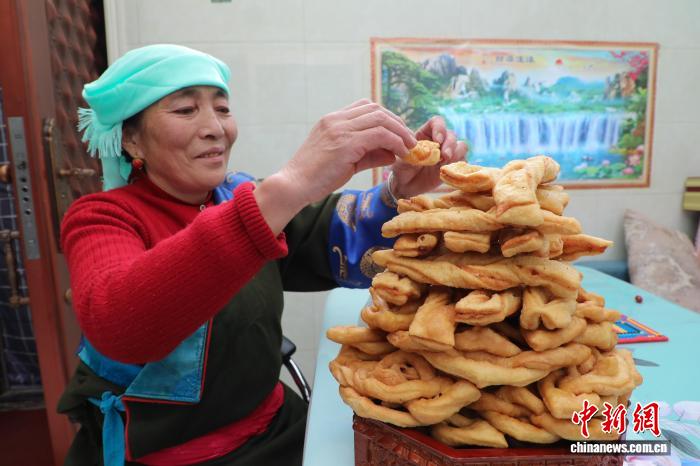 2月16日,中國農(nóng)歷除夕,卓瑪措擺放“卡塞”(藏式點心)。中新社記者 馬銘言 攝