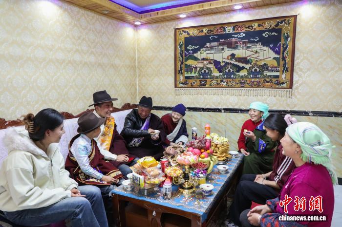 2月16日,中國農(nóng)歷除夕,卓瑪措(右三)帶著晚輩看望85歲老人安措杰(左五)一家。中新社記者 馬銘言 攝