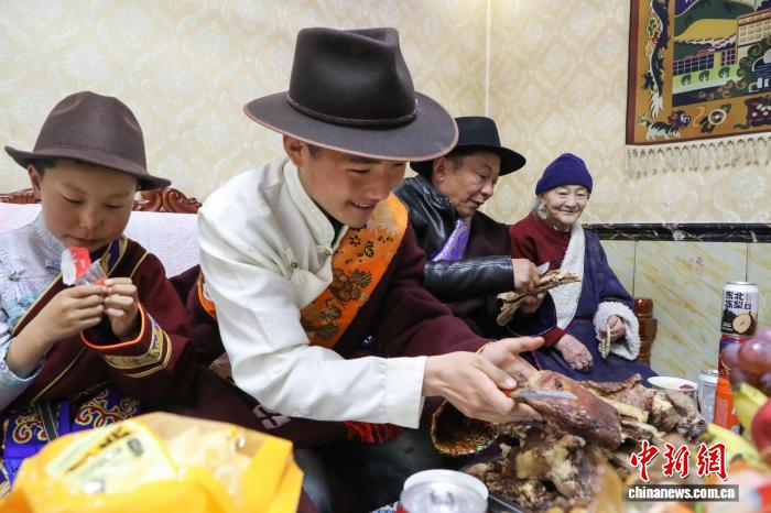 2月16日,中國農(nóng)歷除夕,拉毛扎西(左二)吃牦牛肉。中新社記者 馬銘言 攝