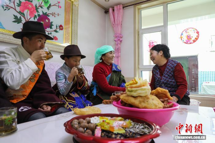 當(dāng)農(nóng)歷春節(jié)遇上藏歷新年(2月18日藏歷新年初一),青海省西寧市湟源縣日月藏族鄉(xiāng),村民們煮牦牛肉、包餃子、擺“卡塞”等藏式點心,走親串友喜迎新春佳節(jié)。