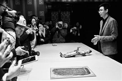 一件黑色打底、褐色花紋的織錦輕輕地用玻璃板夾著,經(jīng)考證它誕生在公元三世紀(jì),雖然“年事已高”,但仔細(xì)看上去仍可清晰辨別出上面有成對的孔雀、鳥等動(dòng)物出現(xiàn),甚至還能看到“王侯”兩個(gè)漢字。據(jù)首博策展人張杰介紹:“從字體看已經(jīng)接近隸書,顯然這是中原生產(chǎn)的,后來傳入西藏。這從一個(gè)側(cè)面說明,當(dāng)年雙方已經(jīng)有文化交往?!?/p>