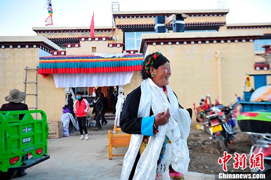 2月21日,村民那日在新居門前迎接賓客。那日的新家坐落在西藏拉薩市達(dá)孜區(qū)德慶鎮(zhèn)的幸福新村,這是西藏精準(zhǔn)扶貧易地搬遷安置點(diǎn)之一。中新社記者 王立林 攝