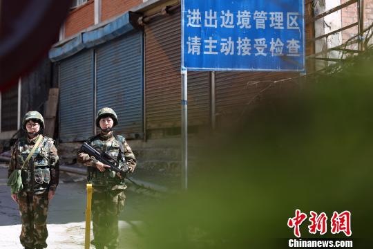 圖為女子巡邏隊(duì)隊(duì)員在遠(yuǎn)處觀察樟木鎮(zhèn)。 羅興偉 攝