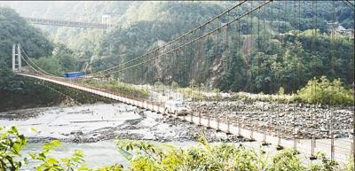 1994年,險峻的雅魯藏布江峽谷建起了魯古吊橋,德興鄉(xiāng)與墨脫縣城從此可通車。圖為4月4日,一輛汽車小心翼翼地從魯古吊橋上通過。鄧建勝攝