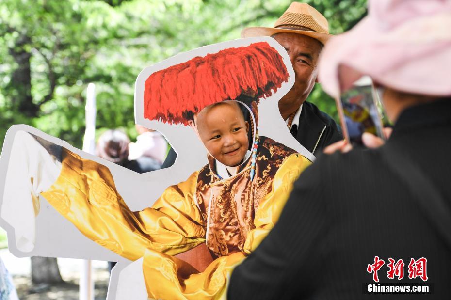 5月25日,2019年“藏戲演出季”第二場演出在西藏拉薩布達拉宮腳下的宗角祿康公園開演。據(jù)了解,2019年藏戲演出季將持續(xù)到今年的7月20日,每周六來自拉薩八縣區(qū)的優(yōu)秀藏戲隊將相繼進行公益表演。圖為當?shù)貎和w驗藏戲人物裝扮造型。中新社記者 何蓬磊 攝