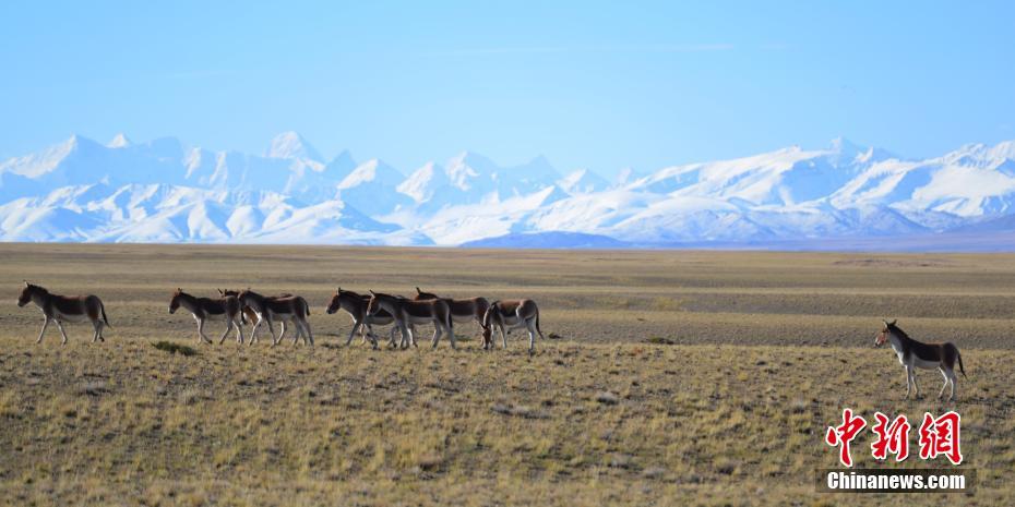 在阿里偶遇藏野驢的概率極高,草原上、小溪旁、濕地里、雪山下……幾乎無(wú)處不在。藏野驢不懼過(guò)往的車輛和行人,不時(shí)還凝視、打探端著相機(jī)的人類,仿佛在思考“驢生”。圖為雪山下的藏野驢。江飛波 攝