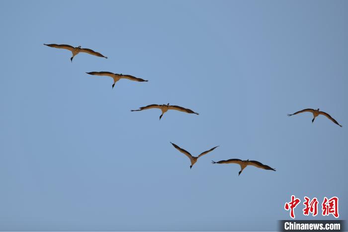 11月15日,一群黑頸鶴翱翔在西藏林周縣巡護(hù)員旦增家上空?!〗w波 攝