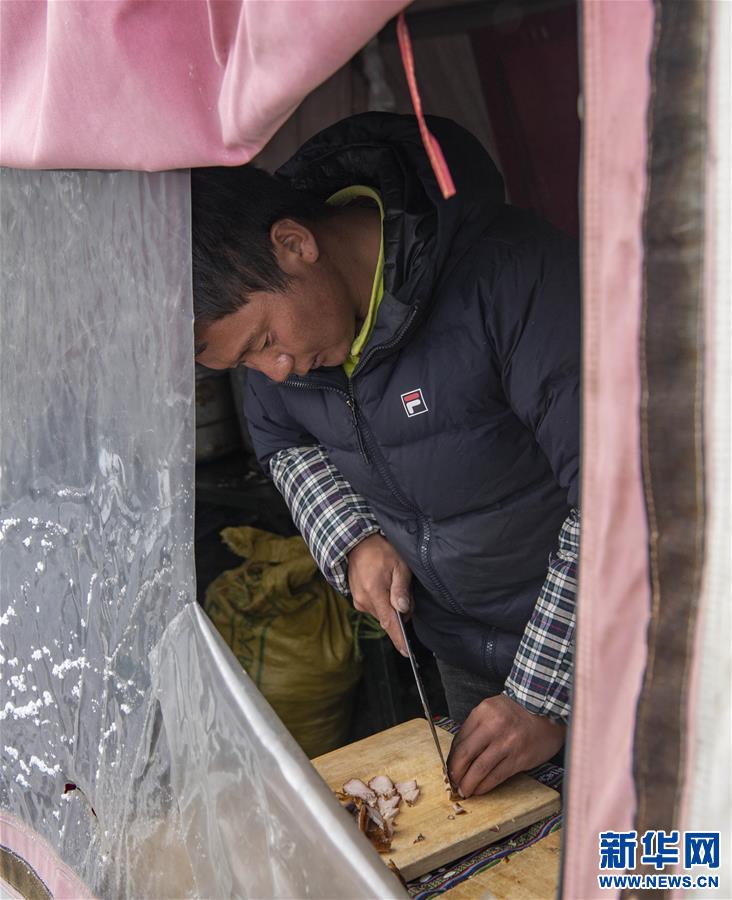 在海拔6500米的前進(jìn)營(yíng)地,高山廚師在準(zhǔn)備菜品(5月10日攝)。新華社記者 孫非 攝