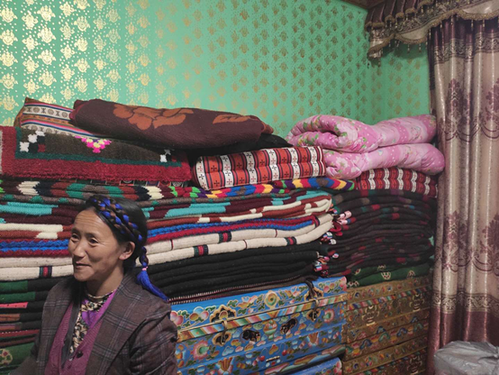 如今,卓瑪家有三層樓,除了自家居住,二樓、三樓提供住宿,一共8間房,可以住16位客人。一樓代賣當(dāng)?shù)氐奶厣a(chǎn)品,柜臺里,門巴木碗、糌粑、蕎麥酒等擺放整齊。照應(yīng)客人的閑暇,卓瑪還會做一些毛線手工編織售賣。算下來,一年的收入有10萬多元。