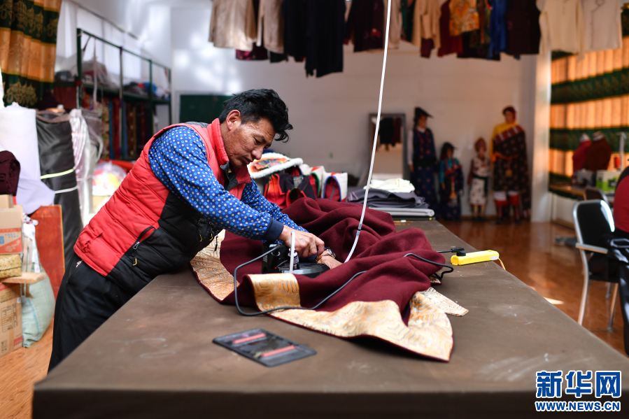 在西藏昌都市江達(dá)縣格?;褡宸椉庸やN售公司,江達(dá)縣字嘎鄉(xiāng)塔字村村民扎西江措在制作藏裝(4月30日攝)。扎西江措學(xué)習(xí)制作藏裝不到兩年時(shí)間,已經(jīng)是一名熟練的制衣工,現(xiàn)在每個(gè)月有4000多元的收入。新華社記者詹彥 攝