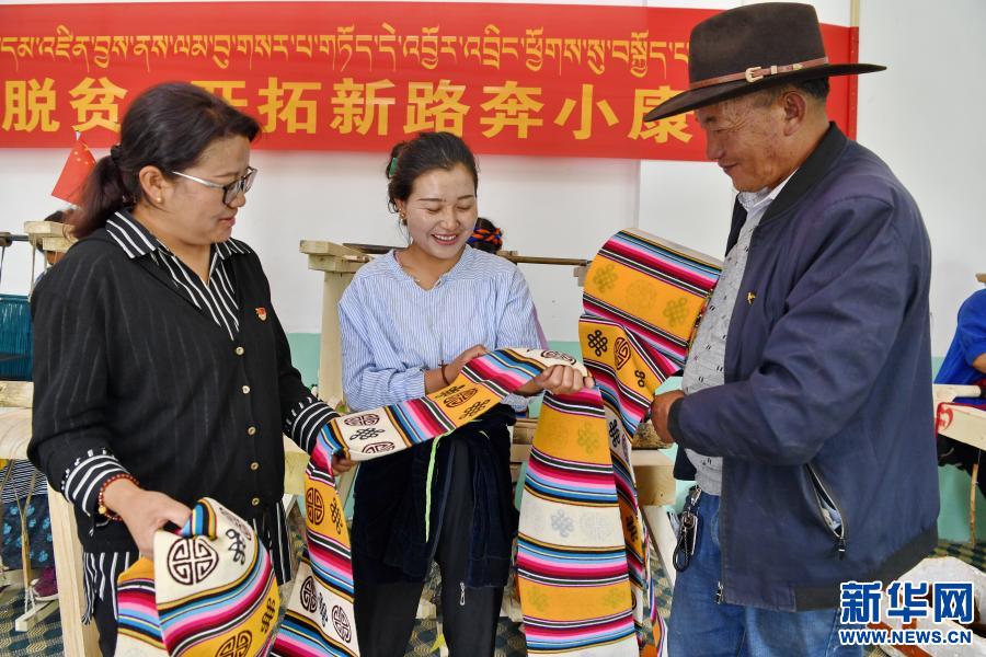 2020年7月6日,西藏扎囊縣吉汝鄉(xiāng)扎西林村駐村工作隊(duì)隊(duì)長(zhǎng)央珍(左)、黨支部書(shū)記旺扎(右)和專(zhuān)業(yè)合作社社員次旺曲珍查看民族手工業(yè)(邦典)質(zhì)量。 新華社記者 張汝鋒 攝
