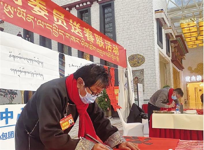 近日,自治區(qū)文聯(lián)、拉薩市文聯(lián)組織8名書法家前往拉薩圣地天堂洲際大飯店為政協(xié)委員送“?!?、送春聯(lián)。
