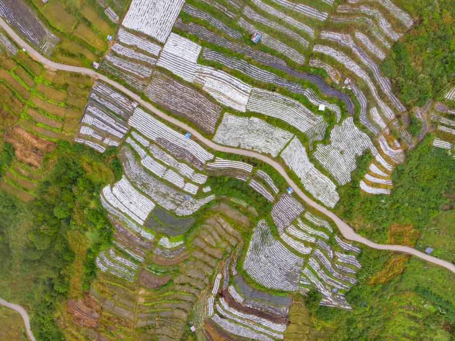 這是穿過西藏墨脫縣郊農(nóng)田的一條農(nóng)村公路(2019年10月26日攝,無(wú)人機(jī)照片)。新華社記者 孫非 攝