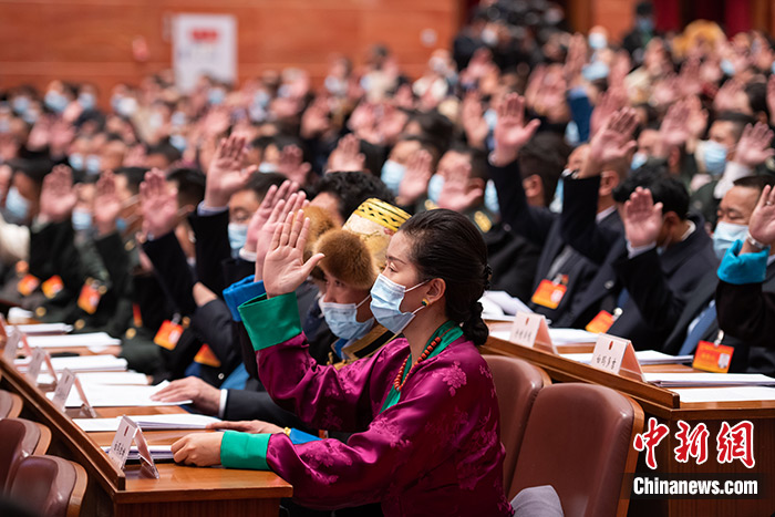 1月24日,西藏自治區(qū)第十一屆人民代表大會(huì)第四次會(huì)議上代表們舉手表決《西藏自治區(qū)國(guó)家生態(tài)文明高地建設(shè)條例(草案)》。中新社記者 何蓬磊 攝