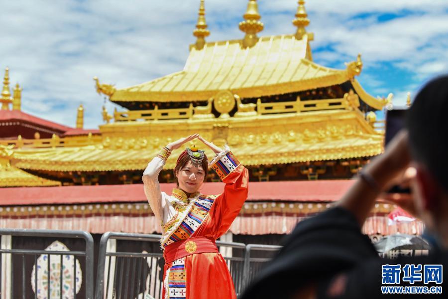 游客在西藏拉薩大昭寺金頂前留影(2020年7月2日攝)。新華社記者 晉美多吉 攝