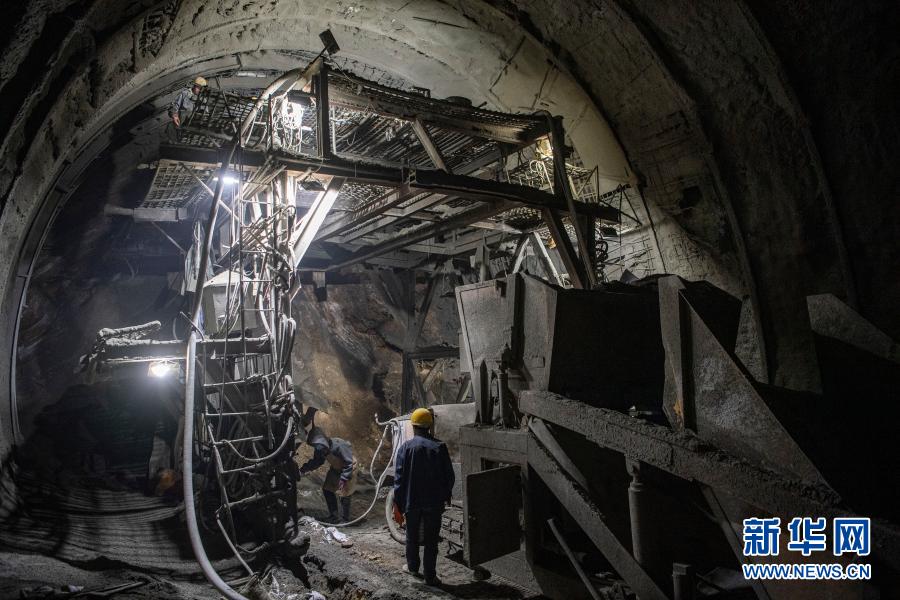 2月10日,在派墨公路老虎嘴隧道出口端,工作人員在進行二次襯砌施工。新華社記者 孫非 攝