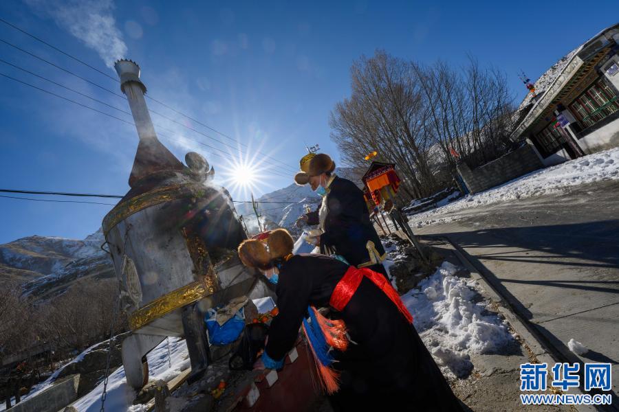 2月12日,在西藏自治區(qū)山南市乃東區(qū)澤當(dāng)鎮(zhèn),格央和父母一起,在藏歷新年第一天轉(zhuǎn)山祈福。這是格央(前)和父親一起煨桑。新華社記者 劉金海 攝