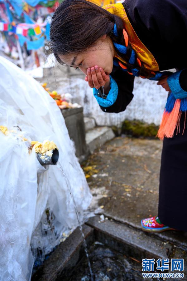 2月12日,在西藏自治區(qū)山南市乃東區(qū)澤當(dāng)鎮(zhèn),格央和父母一起,在藏歷新年第一天轉(zhuǎn)山祈福。這是格央在飲用“吉祥水”。新華社記者 劉金海 攝