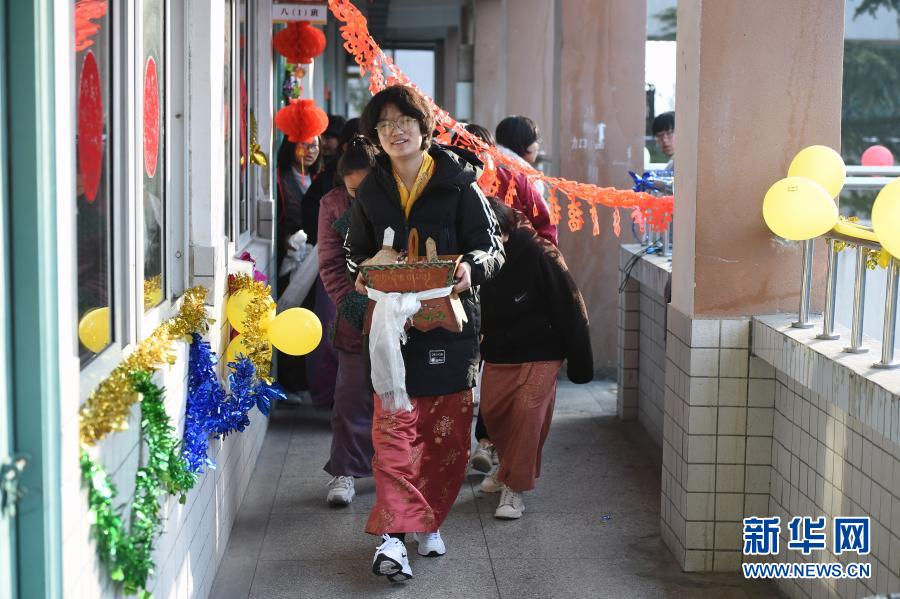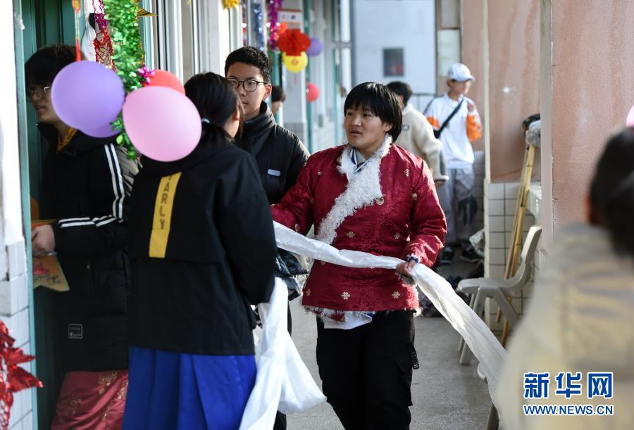 2月12日,合肥市第三十五中學(xué)西藏班的學(xué)生手捧祈福用的切瑪盒行走在校園內(nèi),給老師同學(xué)們拜年。新華社記者 周牧 攝