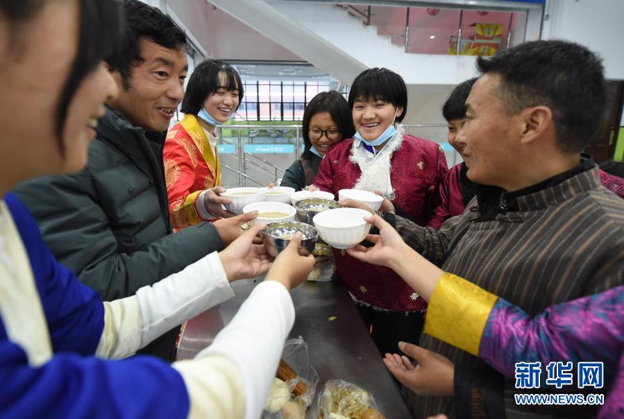 2月12日,合肥市第三十五中學(xué)西藏班的老師和學(xué)生們一起喝藏式甜茶慶祝藏歷新年和農(nóng)歷春節(jié)。新華社記者 周牧 攝