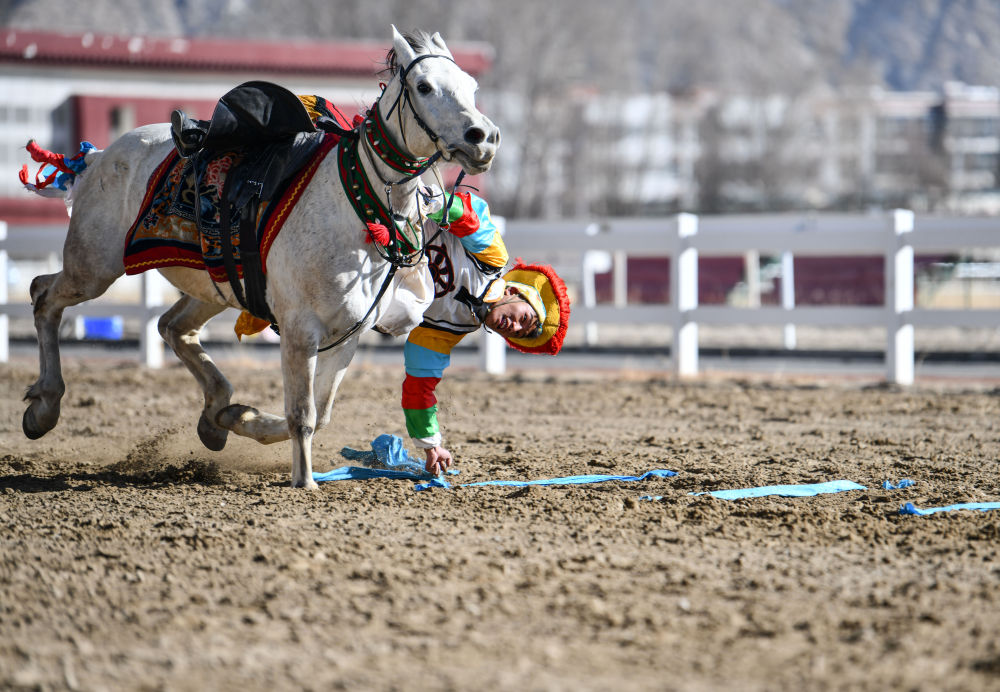 一名騎手在進(jìn)行馬上撿哈達(dá)表演。新華社記者晉美多吉攝