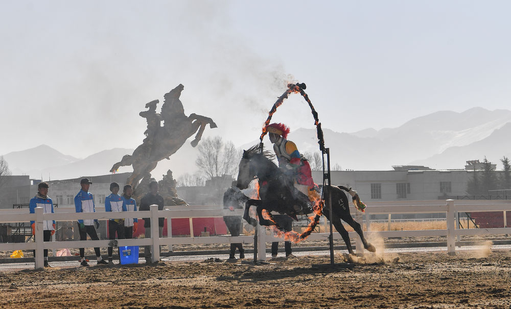 一名騎手在進(jìn)行鉆火圈表演。新華社記者晉美多吉攝