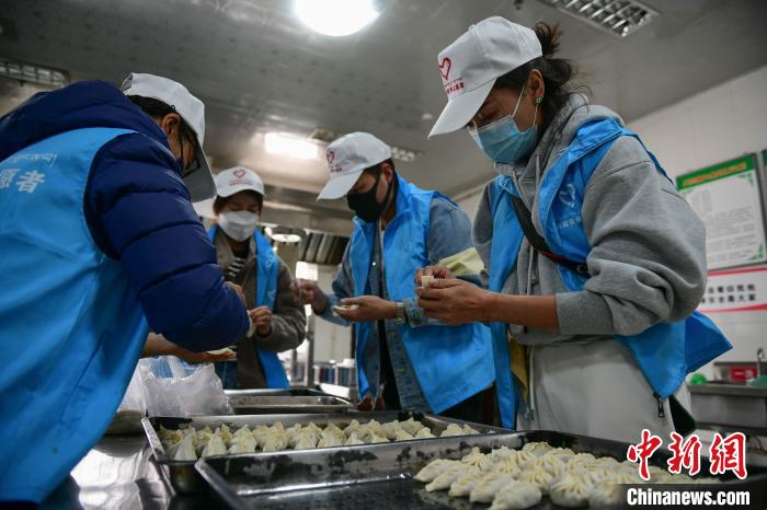 圖為青年志愿者在為福利院老人包餃子?!∝暩聛?lái)松 攝