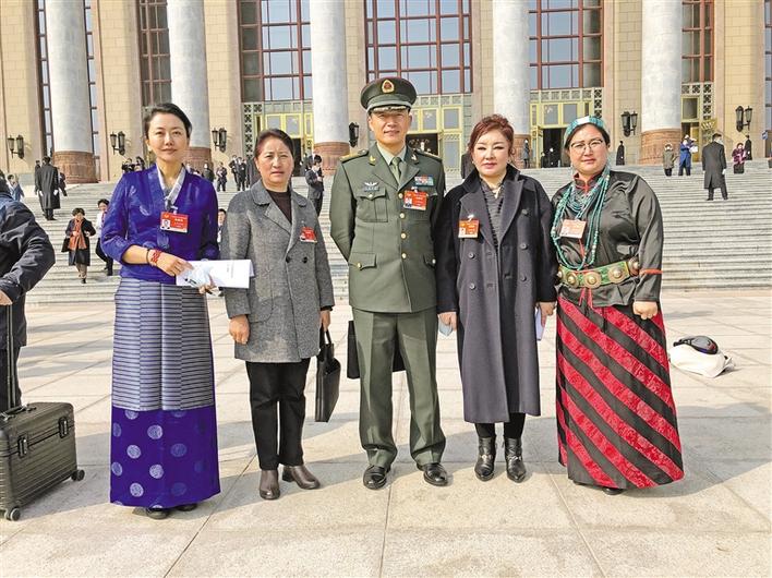 圖為住藏全國政協(xié)委員在會(huì)場(chǎng)外合影。記者 李洲 特約記者 旦增赤列 攝