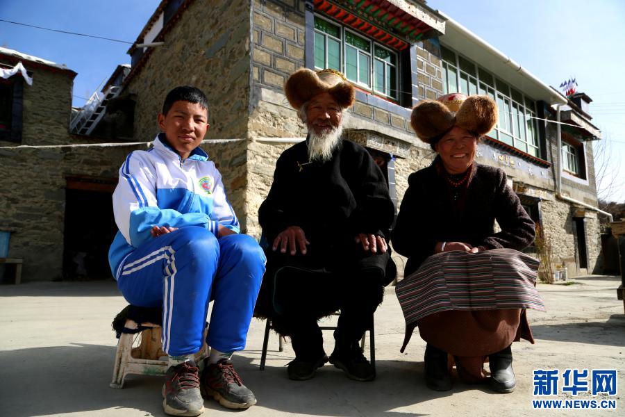 3月19日,尼瑪(中)和女兒、外孫在自家房前合影。新華社記者 阿倫 攝