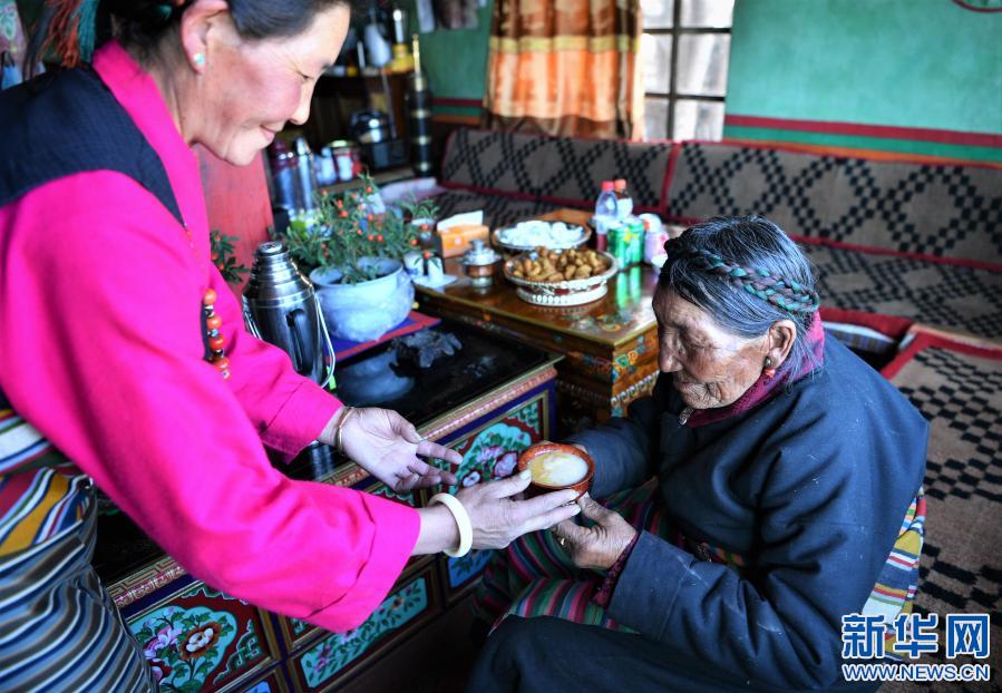 女兒給巴桑獻(xiàn)酥油茶(2月27日攝)。新華社記者 孫非 攝