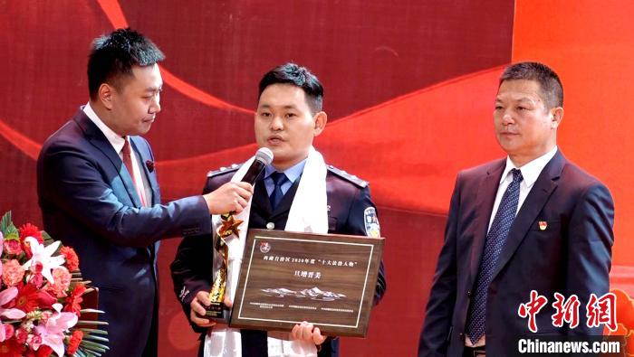 圖為日喀則市定日縣尼轄鄉(xiāng)孔美村第一書記尹傳奇上臺領(lǐng)獎。貢桑拉姆 攝