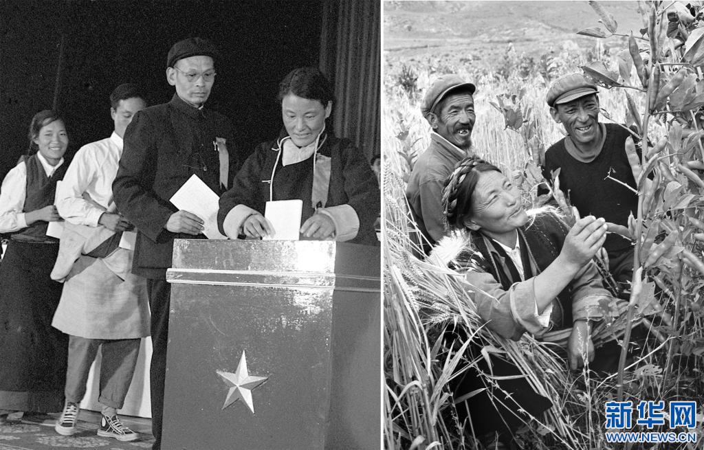 拼版照片:左圖:1965年9月8日,西藏自治區(qū)第一屆人民代表大會第一次會議選舉了西藏自治區(qū)主席、副主席和自治區(qū)人民委員會委員。 次仁拉姆(右一)作為代表正在投票。(新華社資料照片)。右圖:1979年次仁拉姆(前)帶領(lǐng)公社社員開展科學種田,在田間觀察冬小麥和蠶豆套種情況(新華社資料照片)。新華社發(fā)