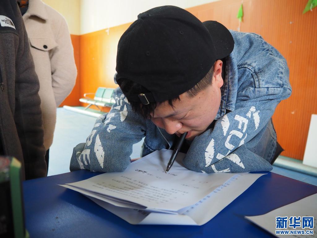 11日下午,位于西藏拉薩市的賽馬場(chǎng)正在舉行一場(chǎng)殘疾人創(chuàng)業(yè)滾動(dòng)資金發(fā)放儀式。岳曉天熟練地用嘴含著筆,在資金發(fā)放協(xié)議書(shū)上簽上了自己的名字,字跡美觀工整,絲毫看不出是用嘴含著筆寫(xiě)的。