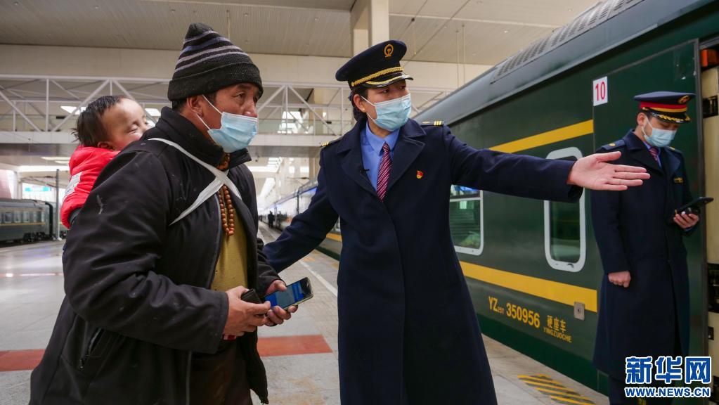 斯朗卓瑪(中)在拉薩火車(chē)站引導(dǎo)乘客上車(chē)(3月22日攝)。新華社記者 旦增尼瑪曲珠 攝