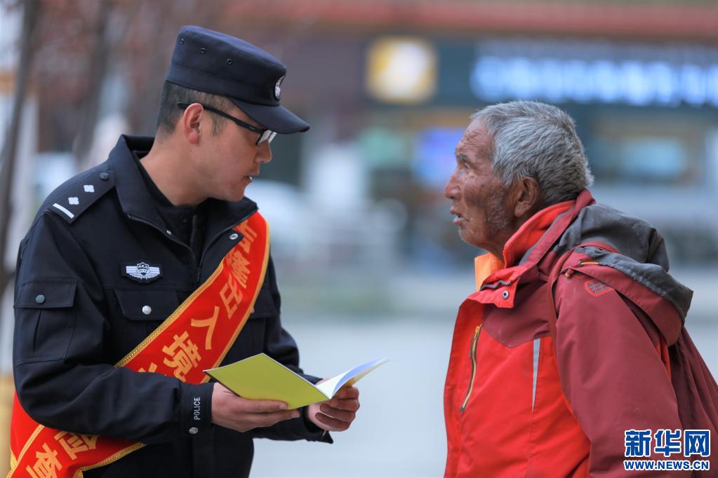 吉隆出入境邊防檢查站警察向駐地邊民普及反恐怖主義法相關(guān)知識(shí)。(新華社發(fā) 肖富貴 攝)