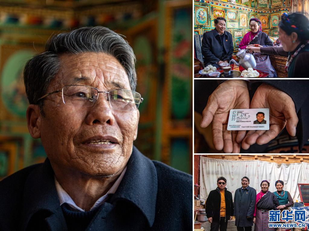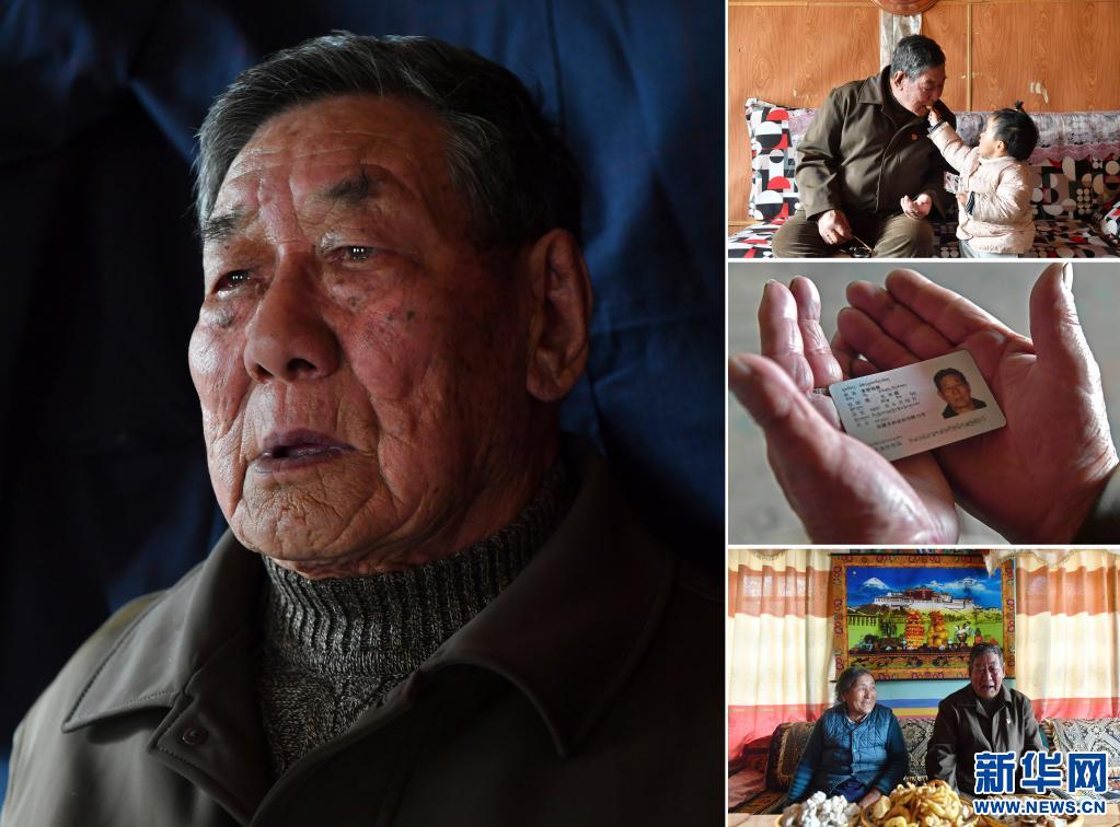 這是一張拼版照片,左圖為邊巴倉(cāng)決的肖像(3月19日新華社記者張汝鋒攝);右上圖為邊巴倉(cāng)決(左二)和鄰居在家里拉家常(3月19日新華社記者孫瑞博攝);右中圖為邊巴倉(cāng)決的身份證(3月19日新華社記者孫瑞博攝);右下圖為邊巴倉(cāng)決和孫子孫媳在一起(3月19日新華社記者張汝鋒攝)。新華社發(fā)